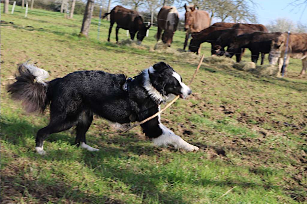 Nous avons eu notre chien avant les ânes et nous avons bien fait attention à ce qu’Eko, notre chien, soit présent le jour de leur arrivée. En espérant que les ânes intègrent que ce terrain est aussi celui d’Eko. Nous n’avons pas permis tout de suite à notre chien d’aller avec les ânes. Il avait déjà rencontré les mules sans trop de soucis, mais là, c’est une autre paire de manche. Eko étant toujours avec nous, chaque jour, il côtoyait les ânes, mais chacun d’un côté de la clôture. Au bout de quelques semaines, nous avons laissé Eko aller dans le pré, tout en le surveillant de près. À présent, les ânes se sont habitués et le tolèrent. Je dis bien « le tolèrent « , car dès que le chien s’agite un peu trop, les ânes l’avertissent qu’il n’est plus le bienvenu proche d’eux. Parfois, les ânes le chargent, lui envoie un coup, ou braient (des fois tout en même temps). Mais jamais ils ne lui ont fait mal pour l’instant. Eko à eux des frayeurs et maintenant il se tient à l’écart et contrôle (plus ou moins) ses moments d’excitations dans le pré. C’est un chien sur le qui-vive avec les ânes qui ne les laisse pas s’approcher trop de lui. Quand tout le monde est calme tout va bien. Parfois, on a des scènes où on ne sait pas s’ils jouent ou se chassent… C’est compliqué.